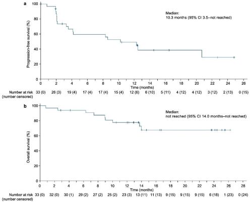 中位PFS为10.3个月(95% CI:3.5-NR),中位OS尚未达到,12个月的OS率为77.7%(95% CI:58.9-88.7)。